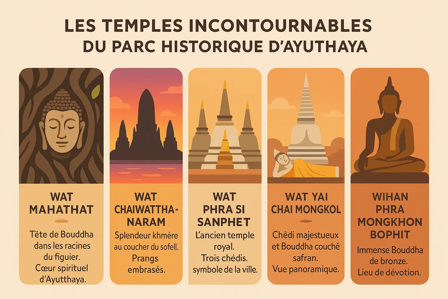 | Sites Majeurs du Matin | Wat Yai Chai Mongkol, Wat Phanan Choeng, Wat Mahathat | Wat Mahathat, Wat Ratchaburana, Musée National Chao Sam Phraya |